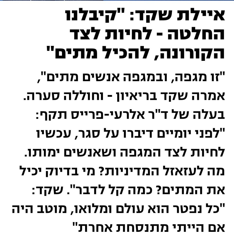 אז איילת שקד אמרה אתמול בריאיון שצריך 'להכיל את החולים והמתים', וקיבלה ביקורת קשה. היא התכוונה לומר שיש לדעת לחיות לצד הקורונה, דעה לגיטימית לחלוטין, אבל לפעמים צריך לדעת לבחור את המילים.